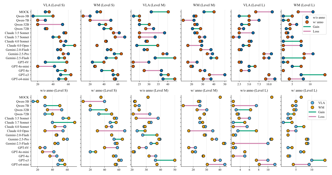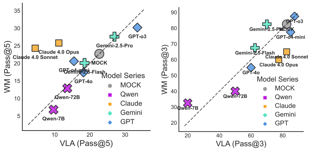 研究团队还设计了两种不同的提示策略来测试模型的能力。视觉-语言-动作(VLA)格式让模型直接基于环境规则、当前视觉观察和历史失败记录来输出动作。而世界模型(WM)格式则要求模型不仅输出动作,还要预测这个动作会产生的环境变化。这种对比设计旨在测试模型是否真正具备内在的物理预测能力。